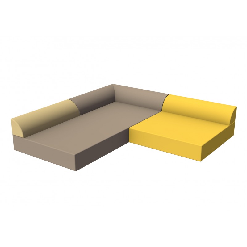 Combinaison d’un matelas medium, d’un dossier d’angle et d’un dossier simple pour créer un espace collectif confortable d’éveil et/ou de loisirs adapté à tous les âges. Les différents éléments se lient entre eux par velcro pour une installation simple et une manipulation facilitée.